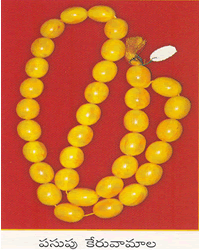 -->పసుపు కేరువామాలను తరచూ కడగడం వల్ల దాని మెరుగు, సొగసు తగ్గిపోతుంది. అందువల్ల జపం చేసేముందు సంకల్ప సిద్ధితో ఈ మాలపై మంత్రోదకాన్ని చిలకరిస్తే సరి. శుద్ధి చేసినట్లూ అవుతుంది, ఎప్పటికీ కొత్తగానే ఉంటుంది.